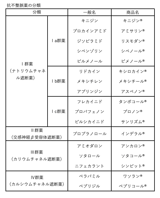 抗不整脈薬はla、Ⅰb、Ⅰc、Ⅱ、Ⅲ、Ⅳと6つに分類されていています。
